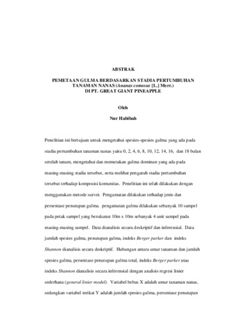 Penelitian ini bertujuan untuk mengetahui spesies-spesies gulma yang ada pada stadia pertumbuhan tanaman nanas yaitu 0, 2, 4, 6, 8, 10, 12, 14, 16, dan 18 bulan setelah tanam, mengetahui dan memetakan gulma dominan yang ada pada masing-masing stadia tersebut, serta melihat pengaruh stadia pertumbuhan tersebut terhadap komposisi komunitas. Penelitian ini telah dilakukan dengan menggunakan metode survei. Pengamatan dilakukan terhadap jenis dan persentase penutupan gulma. pengamatan gulma dilakukan sebanyak 10 sampel pada petak sampel yang berukuran 10m x 10m sebanyak 4 unit sampel pada masing-masing sampel. Data dianalisis secara deskriptif dan inferensial. Data jumlah spesies gulma, penutupan gulma, indeks Berger parker dan indeks Shannon dianalisis secara deskriptif. Hubungan antara umur tanaman dan jumlah spesies gulma, persentase penutupan gulma total, indeks Berger parker atau indeks Shannon dianalisis secara inferensial dengan analisis regresi linier sederhana (general linier model). Variabel bebas X adalah umur tanaman nanas, sedangkan variabel terikat Y adalah jumlah spesies gulma, persentase penutupan gulma, indeks Berger parker dan indeks Shannon. Analisis regresi dilakukan pada taraf nyata 5 %. Hubungan antara indeks Berger parker dan SDR (Summed Dominance Ratio) di analisis dengan analisis korelasi. Hasil penelitian menunjukkan bahwa berbagai spesies gulma rumput, teki, dan daun lebar di PT. GGP ditemukan pada pertanaman nanas umur 4, 6, 8, 10, 12, 14, 16, dan 18 bulan. Pada pertanaman nanas yang berumur 0 dan 2 bulan tidak ditemukan gulma. Jumlah spesies gulma yang ditemukan sebanyak 32 spesies. Terdapat hubungan linier antara stadia pertumbuhan tanaman nanas dengan jumlah spesies gulma, dan indeks shannon. Tidak terdapat hubungan linear antara persentase penutupan gulma dan indeks berger parker. Terdapat hubungan yang sangat erat antara indeks berger parker dengan SDR (Summed Dominance Ratio). Kata kunci : Komposisi spesies gulma, stadia pertumbuhan, tanaman nanas