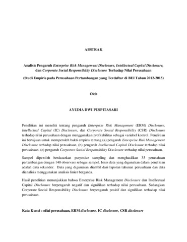 AYUDIA DWI PUSPITASARI, 1341031007 (2017) Analisis Pengaruh Enterprise Risk Management Disclosure, Intellectual Capital Disclosure, dan Corporate Social Responsibility Disclosure Terhadap Nilai Perusahaan (Studi Empiris pada Perusahaan Pertambangan yang Terdaftar di BEI Tahun 2012-2015). FAKULTAS EKONOMI DAN BISNIS, UNIVERSITAS LAMPUNG.