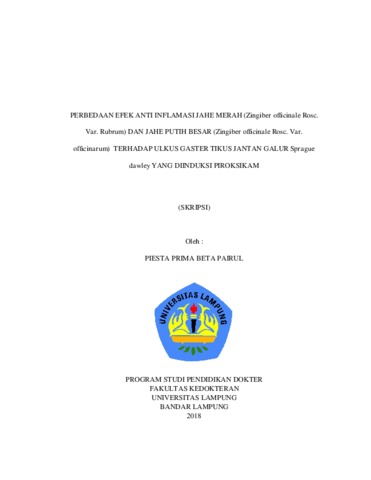 PIESTA PRIMA BETA PAIRUL, 1418011163 (2018) PERBEDAAN EFEK ANTI INFLAMASI JAHE MERAH (Zingiber officinale Rosc. Var. Rubrum) DAN JAHE PUTIH BESAR (Zingiber officinale Rosc. Var. officinarum) TERHADAP ULKUS GASTER TIKUS JANTAN GALUR Sprague dawley YANG DIINDUKSI PIROKSIKAM. Fakultas Kedokteran, Universitas Lampung.