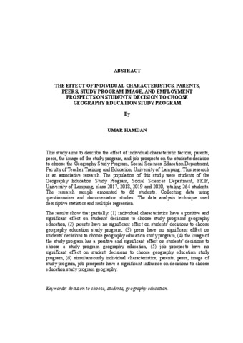 Penelitian ini bertujuan untuk mendeskripsikan pengaruh faktor karakteristik individu, orang tua, teman sebaya, citra program studi, dan prospek lapangan pekerjaan terhadap keputusan mahasiswa memilih Progam Studi Geografi Jurusan Pendidikan IPS Fakultas Keguruan dan Ilmu Pendidikan Universitas Lampung. Penelitian ini merupakan penelitian asosiatif. Populasi penelitian ini adalah mahasiswa Program Studi Pendidikan Geografi Jurusan IPS FKIP Universitas Lampung angkatan 2017, 2018, 2019 dan 2020 yang berjumlah 264 mahasiswa. Sampel penelitian berjumlah 66 mahasiswa. Pengumpulan data menggunakan, kuesioner dan studi dokumentasi. Teknik analisis data menggunakan statistik deskriptif dan regresi ganda. Hasil penelitian menunjukkan bahwa secara parsial: (1) karakteristik individu berpengaruh positif dan signifikan terhadap keputusan mahasiswa memilih prodi pendidikan geografi, (2) orang tua tidak berpengaruh signifikan terhadap keputusan mahasiswa memilih prodi pendidikan geografi, (3) teman sebaya tidak berpengaruh signifikan terhadap keputusan mahasiswa memilih prodi pendidikan geografi, (4) citra program studi berpengaruh positif dan signifikan terhadap keputusan mahasiswa memilih prodi pendidikan geografi, (5) prospek lapangan pekerjaan tidak berpengaruh signifikan terhadap keputusan mahasiswa memilih prodi pendidikan geografi, (6) secara simultan karakteristik individu, orang tua, teman sebaya, citra program studi, prospek lapangan kerja memiliki pengaruh yang signifikan terhadap keputusan memilih prodi pendidikan geografi Kata kunci : keputusan memilih, mahasiswa, pendidikan geografi, This study aims to describe the effect of individual characteristic factors, parents, peers, the image of the study program, and job prospects on the student's decision to choose the Geography Study Program, Social Sciences Education Department, Faculty of Teacher Training and Education, University of Lampung. This research is an associative research. The population of this study were students of the Geography Education Study Program, Social Sciences Department, FKIP, University of Lampung, class 2017, 2018, 2019 and 2020, totaling 264 students. The research sample amounted to 66 students. Collecting data using questionnaires and documentation studies. The data analysis technique used descriptive statistics and multiple regression. The results show that partially: (1) individual characteristics have a positive and significant effect on students' decisions to choose study programs geography education, (2) parents have no significant effect on students' decisions to choose geography education study program, (3) peers have no significant effect on students' decisions to choose geography education study program, (4) the image of the study program has a positive and significant effect on students' decisions to choose a study program geography education, (5) job prospects have no significant effect on student decisions to choose geography education study program, (6) simultaneously individual characteristics, parents, peers, image of study program, job prospects have a significant influence on decisions to choose education study program geography. Keywords: decision to choose, students, geography education.