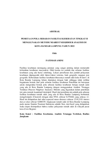 Fasilitas kesehatan memegang peranan yang sangat penting dalam memenuhi kebutuhan kesehatan masyarakat. Oleh karena itu jumlah dan sebaran fasilitas kesehatan yang ada harus seimbang. Lokasi persebaran dan jumlah pelayanan kesehatan dipengaruhi oleh faktor-faktor tertentu, baik geografis maupun non geografis. Keberadaan fasilitas kesehatan khususnya rumah sakit kelas B dan C di Kota Bandar Lampung belum dipetakan dengan baik sehingga tidak terlihat bagaimana bentuk dari pola sebaran fasilitas kesehatan Penelitian ini bertujuan untuk mengetahui bentuk pola sebaran fasilitas kesehatan berupa rumah sakit yang ada di Kota Bandar Lampung dengan menggunakan Analisis Tetangga Terdekat (Nearest Neigbour Analysis). Metode yang digunakan dalam penelitian ini yaitu metode kuantitatif deskriptif. Hasil dari penelitian ini adalah pola sebaran fasilitas kesehatan rumah sakit yang ada di Kota Bandar Lampung berbentuk mengelompok (Clusterd) dengan nilai NNA sebesar 0,570266 yang artinya >1. Hasil ini didapatkan dari nilai expected mean distance sebesar 1518,2191 meters dan p-value sebesar 0,000339. Jangkauan rumah sakit di Kota Bandar Lampung pada aturan Standar Nasional Indonesia adalah 3km, dari hasil yang didapatkan maka dapat disimpulkan bahwa radius pelayanan rumah sakit di wilayah pusat kota (Core Region) Kata Kunci : Fasilitas Kesehatan, Analisis Tetangga Terdekat, Radius Jangkaun ABSTRACT Health facilities play a very important role in meeting the health needs of the community. Therefore, the number and distribution of existing health facilities must be balanced. The distribution location and number of health services are influenced by certain factors, both geographical and non-geographical.The existence of health facilities, especially class B and C hospitals in Bandar Lampung City, has not been mapped properly so that it is not visible what shape the distribution pattern of health facilities is in. This study aims to determine the shape of the distribution pattern of health facilities in the form of hospitals in Bandar Lampung City by using Analysis Nearest Neighbor (Nearest Neigbor Analysis). The method used in this research is descriptive quantitative method. The results of this study are that the pattern of distribution of hospital health facilities in Bandar Lampung City is uniform or clusterd nwith an NNA value of 0,570266 which means > 1. These results were obtained from the expected mean distance of 1518,2191 meters and a p-value of 0.000339. The range of hospitals in Bandar Lampung City according to the Indonesian National Standard rules is 3km, from the results obtained it can be concluded that the radius of hospital services in the downtown area (Core Region). By Fatimah Amini Keywords: Health Facilities, Nearest Neighbor Analysis, Reach Radius