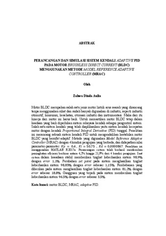 Zahwa Dinda , Aulia (2023) PERANCANGAN DAN SIMULASI SISTEM KENDALI ADAPTIVE PID PADA MOTOR BRUSHLESS DIRECT CURRENT (BLDC) MENGGUNAKAN METODE MODEL REFERENCE ADAPTIVE CONTROLLER (MRAC). FAKULTAS TEKNIK, UNIVERSITAS LAMPUNG.