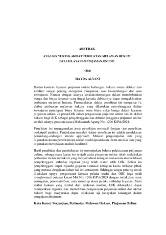 Dalam konteks layanan pinjaman online hubungan hukum antara debitur dan kreditur sangat penting mengenai transparasi, asas keseimbangan dan asas kewajaran. Namun dengan adanya ketidakseimbangan dalam membebankan bunga dan biaya layanan yang tinggi kepada debiturnya dapat mengakibatkan perbuatan melawan hukum. Permasalahan dalam penelitian ini mengenai 1). akibat perbuatan melawan hukum yang dilakukan penyelenggara dalam kewajaran penerapan biaya layanan serta biaya suku bunga dalam layanan pinjaman online, 2). peran OJK dalam pengawasan pinjaman online dan 3). akibat hukum bagi OJK sebagai penyelenggara dan debitur pengguna pinjaman online setelah adanya putusan kasasi Mahkamah Agung No. 1206 K/Pdt/2024. Penelitian ini menggunakan jenis penelitian normatif dengan tipe penelitian deskriptif analisis. Pendekatan masalah dalam penelitian ini adalah pendekatan perundang-undangan statute approach. Metode pengumpulan data yang digunakan dalam penelitian ini adalah studi kepustakaan. Serta analisis data yang digunakan merupakan analisis kualitatif. Hasil penelitian dan pembahasan ini menunjukan bahwa pelaksanaan pinjaman online, sebagaimana kasus ini terjadi pada pinjaman online telah melakukan perbuatan melawan hukum yang menyebabkan kerugian konsumen atas kelalaian penyelenggara terhadap regulasi yang telah diatur oleh OJK. Selain itu penyelenggara dapat dijatuhi gugatan tuntutan kerugian karna terdapat pihak yang merasa dirugikan dalam hal ini konsumen. Sehingga sangat penting untuk dilakukan upaya pengawasan kepada pelaku usaha dan OJK juga telah menghormati putusan kasasi MA No. 1206 K/Pdt/2024 dengan melakukan surat peringatan, penonaktifkan, atau menutup akses pelaku terhadap layanan. Serta akibat hukum yang timbul dari tindakan tesebut, OJK diharapkan dapat memperkuat regulasi dan memelihara pengawasan pinjaman online dan akibat hukum bagi masyarakat dapat dilakukan uji kelayakan keuangan dalam pengajuan pinjaman. Kata Kunci: Perjanjian, Perbuatan Melawan Hukum, Pinjaman Online In the context of online loan services, the legal relationship between debtors and creditors is very important regarding transparency, the principle of balance and the principle of fairness. However, the imbalance in charging high interest and service fees to debtors can result in unlawful acts. The problems in this study are 1). the consequences of unlawful acts committed by the organizer in the fairness of the application of service fees and interest rates in online loan services, 2). the role of OJK in supervising online loans and 3). legal consequences for OJK as an organizer and online loan user debtors after the Supreme Court cassation decision No. 1206 K/Pdt/2024. This research uses normative research with descriptive analysis type. The problem approach in this research is the statute approach. The data collection method used in this research is literature study. And the data analysis used is qualitative analysis. The results of this research and discussion show that the implementation of online loans, as this case occurs in online loans, has committed a tort that causes consumer losses due to the negligence of the organizers of the regulations that have been regulated by the OJK. In addition, the organizer can be sued for damages because there are parties who feel harmed in this case consumers. So it is very important to make efforts to supervise business actors and OJK has also respected the Supreme Court cassation decision No. 1206 K/Pdt/2024 by conducting warning letters, deactivating, or closing the perpetrator's access to services. As well as the legal consequences arising from these actions, OJK is expected to strengthen regulations and maintain supervision of online loans and the legal consequences for the community can be carried out financial feasibility tests in applying for loans. Keywords: Agreement, Unlawful Act, Online Loan