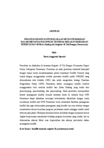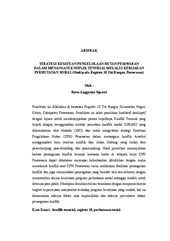 Penelitian ini dilakukan di kawasan Register 18 Titi Bungur Kecamatan Negeri Katon, Kabupaten Pesawaran. Penelitian ini ialah penelitian kualitatif deskriptif dengan tujuan untuk mendeskripsikan proses terjadinya Konflik Tenurial yang terjadi dengan menggunakan metode pemetaan konflik model SIPABIO yang dikemukakan oleh Abdalla (2002) dan untuk mengetahui strategi Kesatuan Pengelolaan Hutan (KPH) Pesawaran dalam menangani konflik tersebut menggunakan teori resolusi konflik dari Johan Galtung yang terdiri dari peacekeeping, peacebuilding, dan peacemaking. Hasil penelitian menunjukkan bahwa penanganan konflik tenurial kawasan hutan di wilayah kerja KPH Pesawaarn dapat dikatakan mencapai keberhasilan dibuktikan dengan mulai meredanya konflik saat KPH Pesawaran turun melakukan fasilitasi penanganan konflik dan juga rekomendasi penanganan yang bersifat win-win solution dengan menawarkan skema kemitraan program perhutanan sosial sehingga mudah untuk diterima para pihak. Meskipun demikian belum terealisasi dengan sempurna karena tingkat kepercayaan masyarakat terhadap program kemitraan yang rendah, hal ini dikarenakan adanya faktor rasa kepemilikan dan adanya provokator dalam penanganan konflik. Kata Kunci : konflik tenurial, register 18, perhutanan sosial. This research was conducted in the Register 18 Titi Bungur area, Negeri Katon District, Pesawaran Regency. This research is descriptive qualitative research with the aim of describing the process of the Tenurial Conflict that occurred using the SIPABIO model conflict mapping method proposed by Abdalla (2002) and to determine the strategy of the Pesawaran Forest Management Unit (KPH) in handling the conflict using conflict resolution theory from Johan Galtung which consists of peacekeeping, peacebuilding and peacemaking. The results of the research show that the handling of forest area tenure conflicts in the work area of KPH Pesawaran can be said to have achieved success as evidenced by the conflict starting to subside when KPH Pesawaran stepped in to facilitate conflict handling and also recommendations for handling that are win-win solutions by offering a social forestry program partnership scheme so that it is easy to be accepted by the parties. However, it has not been realized perfectly because the level of public trust in the partnership program is low, this is due to the feeling of ownership factor and the presence of provocateurs in handling conflict. Keywords: tenure conflict, register 18, social forestry.