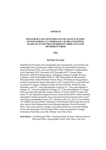 Penelitian ini bertujuan untuk mengetahui lama penyimpanan yang berbeda dan mengetahui lama penyimpanan terbaik terhadap uji organoleptik, kandungan Neutral Detergent Fiber, dan Acid Detergent Fiber. Penelitian ini dilaksanakan bulan September 2023--Desember 2023 bertempat di PT. Gunung Madu Plantations, KM 90 Terbanggi Besar, Kabupaten Lampung Tengah, Provinsi Lampung. Analisi Kandungan NDF dan ADF dilaksanakan di Laboratorium Pelayanan Kimia, Balai Penelitian Ternak, Bogor. Penelitian ini menggunakan metode eksperimental dengan Rancangan Acak Lengkap (RAL) yang terdiri dari 4 perlakuan 5 ulangan, sehingga terdapat 20 unit percobaan. Perlakuan yang digunakan yaitu P0 : Lama penyimpanan 0 minggu, P1 : Lama penyimpanan 4 minggu, P2 : Lama penyimpanan 8 minggu, P3 : Lama penyimpanan 12 minggu. Data yang diperoleh dianalisis dengan Analisis of Varian (ANOVA) pada taraf nyata 5%, dan dilanjutkan dengan uji benar nyata terkecil (BNT). Hasil penelitian menunjukan terdapat pengaruh yang nyata pada lama penyimpanan silase pucuk tebu dengan penambahan molases 5%, amonium sulfat 1%, urea 1% dan dolomit 1% terhadap uji organoleptik, kandungan Acid Detergent Fiber pada silase pucuk tebu, namun tidak berpengaruh nyata terhadap kandungan Neutral Detergent Fiber. Lama penyimpanan 4 minggu menunjukan hasil data yang baik terhadap tekstur dan kandungan Acid Detergent Fiber, tetapi penyimpanan 0 minggu menunjukan hasil data yang baik terhadap warna dan aroma. Kata Kunci : Acid Detergent Fiber, Amonium Sulfat, Dolomit, Molases, Neutral Detergent Fiber, Organoleptik, Pucuk Tebu, Silase, dan Urea . ABSTRACT EFFECT OF LONG STORAGE OF SUGAR CANE SILAGE (ESTOSI FORMULA 2) ON ORGANOLEPTIC TESTS, NEUTRAL DETERGENT FIBER CONTENT, AND ACID DETERGENT FIBER By Siti Nina Sri Utami This research aims to determine different storage times and determine the best storage length for organoleptic tests, content of Neutral Detergent Fiber and Acid Detergent Fiber.. This research was carried out in September 2023--December 2023 at PT. Gunung Madu Plantations, KM 90 Terbanggi Besar, Central Lampung Regency, Lampung Province. NDF and ADF content analysis was carried out at the Chemical Services Laboratory, Animal Research Institute, Bogor. This research used an experimental method with a Completely Randomized Design (CRD) consisting of 4 treatments and 5 replications, so there were 20 experimental units. The treatments used were P0: Storage duration 0 weeks, P1: Storage duration 4 weeks, P2: Storage duration 8 weeks, P3: Storage duration 12 weeks. The data obtained were analyzed using Analysis of Variance (ANOVA) at a significance level of 5%, and continued with the least significant true test (LSD). The results of the research showed that there was a real influence on the storage time of sugarcane top silage with the addition of 5% molasses, 1% ammonium sulfate, 1% urea and 1% dolomite on organoleptic tests, Acid Detergent Fiber content in sugarcane top silage, but there was no significant effect on the content of sugarcane top silage. A storage period of 4 weeks shows good data results on the texture and content of Acid Detergent Fiber, but 0 weeks of storage shows good data results on color and aroma. Keywords : Acid Detergent Fiber, Ammonium Sulfate, Dolomite, Molasses, Neutral Detergent Fiber, Organoleptics, Silage, Sugarcane Shoots and Urea.