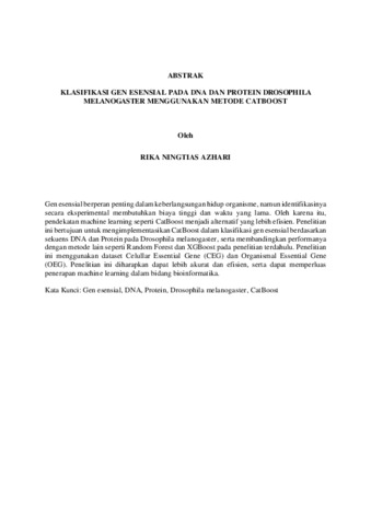 Gen esensial berperan penting dalam keberlangsungan hidup organisme, namun identifikasinya secara eksperimental membutuhkan biaya tinggi dan waktu yang lama. Oleh karena itu,pendekatan machine learning seperti CatBoost menjadi alternatif yang lebih efisien. Penelitian ini bertujuan untuk mengimplementasikan CatBoost dalam klasifikasi genesensial berdasarkan sekuens DNA dan Protein pada Drosophila melanogaster, serta membandingkan performanya dengan metode lain seperti Random Forest dan XGBoost pada penelitian terdahulu. Penelitian ini menggunakan dataset Celullar Essential Gene (CEG) dan Organismal Essential Gene (OEG). Penelitian ini diharapkan dapat lebih akurat dan efisien, serta dapat memperluas penerapan machine learning dalam bidang bioinformatika.