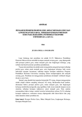 JULISA DELLA , ANGGRAINI (2025) PENGARUH PERSEPSI PROFESI GURU, MINAT MENJADI GURU DAN LINGKUNGAN KELUARGA, TERHADAP KESIAPAN MENJADI GURU PADA MAHASISWA PENDIDIKAN EKONOMI UNIVERSITAS LAMPUNG. FAKULTAS KEGURUAN DAN ILMU PENDIDIKAN, UNIVERSITAS LAMPUNG.