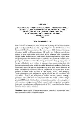 Zahra , Maria Ulfa (2024) PENGEMBANGAN PERANGKAT SOFTSKILL ASSESSMENT PADA PEMBELAJARAN BERBASIS MASALAH, MENINGKATKAN KETERAMPILAN KOLABORASI, KETERAMPILAN KOMUNIKASI DAN KETERAMPILAN SOSIAL PESERTA DIDIK. Masters thesis, UNIVERSITAS LAMPUNG.