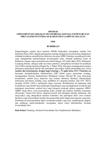 Burhibani, - (2025) IMPLEMENTASI GERAKAN SWASEMBADA GIZI DALAM PENURUNAN PREVALENSI STUNTING DI KABUPATEN LAMPUNG SELATAN. Masters thesis, UNIVERSITAS LAMPUNG.