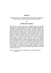 This study aims to analyze preferences, consumption patterns and consumer satisfaction for crystal palm sugar at modern markets in Bandar Lampung City. The study used a survey method with data collection conducted in February 2025. Respondents totaled 60 people who were taken by accidental sampling in four selected modern market locations, which are Chandra Supermarket, Chandra Mini Market, Super Indo, and Fitrinofane. The analytical methods used are conjoin analysis, quantitative descriptive analysis, Customer Satisfaction Index (CSI), and Importance Performance Analysis (IPA). The research found that consumer preferences at modern market in Bandar Lampung City for crystal palm sugar are fragrant aroma, coarse grain texture, dark brown color, 250 gram using standing pouch packaging. Consumers consume crystal palm sugar as an alternative sweetener and the brands that are widely purchased are Aromanis, Haan, and Edna. The 250 gram6666 size is the usual size purchased by consumers with a purchase frequency of one to two times and a consumption frequency of fifteen times per month. The number of purchases made was 272 grams per month and the amount of consumption was 176 grams per month. Consumer satisfaction is in the very satisfied category. The attributes of crystal palm sugar that need to be maintained are price attributes, ease of obtaining, availability of expiration dates, halal labels, and distribution permits. Penelitian ini bertujuan untuk menganalisis preferensi, pola konsumsi dan kepuasan konsumen terhadap gula aren kristal di pasar modern Kota Bandar Lampung. Penelitian ini menggunakan metode survei dengan pengumpulan data yang dilakukan pada bulan Februari 2025. Responden berjumlah 60 orang yang diambil secara accidental sampling di empat lokasi pasar modern terpilih, yaitu Chandra Supermarket, Chandra Mini Market, Super Indo, dan Fitrinofane. Metode analisis yang digunakan adalah analisis konjoin, analisis deskriptif kuantitatif, Customer Satisfaction Index (CSI), dan Importance Performance Analysis (IPA). Hasil penelitian menunjukkan bahwa preferensi konsumen di pasar modern di Kota Bandar Lampung terhadap gula aren kristal adalah aroma harum, tekstur butiran kasar, warna coklat tua, ukuran 250 gram menggunakan kemasan standing pouch. Konsumen mengonsumsi gula aren kristal sebagai pemanis alternatif dan merek yang banyak dibeli adalah Aromanis, Haan, dan Edna. Ukuran 250 gram merupakan ukuran yang biasa dibeli oleh konsumen dengan frekuensi pembelian sebanyak satu hingga dua kali dan frekuensi konsumsi sebanyak lima belas kali per bulan. Jumlah pembelian yang dilakukan sebanyak 272 gram per bulan dan jumlah konsumsi sebanyak 176 gram per bulan. Kepuasan konsumen berada pada kategori sangat puas. Atribut gula aren kristal yang perlu dipertahankan adalah atribut harga, kemudahan mendapatkan, ketersediaan tanggal kadaluwarsa, label halal, dan izin edar.