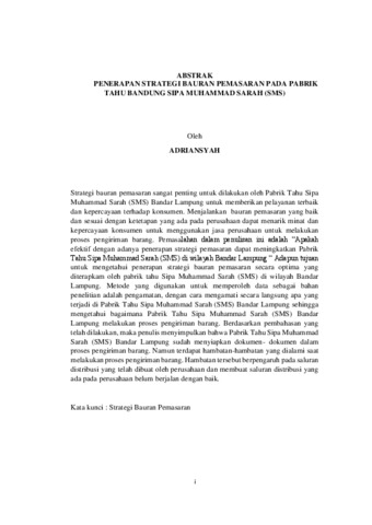 Strategi bauran pemasaran sangat penting untuk dilakukan oleh Pabrik Tahu Sipa Muhammad Sarah (SMS) Bandar Lampung untuk memberikan pelayanan terbaik dan kepercayaan terhadap konsumen. Menjalankan bauran pemasaran yang baik dan sesuai dengan ketetapan yang ada pada perusahaan dapat menarik minat dan kepercayaan konsumen untuk menggunakan jasa perusahaan untuk melakukan proses pengiriman barang. Pemasalahan dalam penulisan ini adalah “Apakah efektif dengan adanya penerapan strategi pemasaran dapat meningkatkan Pabrik Tahu Sipa Muhammad Sarah (SMS) di wilayah Bandar Lampung “ Adapun tujuan untuk mengetahui penerapan strategi bauran pemasaran secara optima yang diterapkam oleh pabrik tahu Sipa Muhammad Sarah (SMS) di wilayah Bandar Lampung. Metode yang digunakan untuk memperoleh data sebagai bahan penelitian adalah pengamatan, dengan cara mengamati secara langsung apa yang terjadi di Pabrik Tahu Sipa Muhammad Sarah (SMS) Bandar Lampung sehingga mengetahui bagaimana Pabrik Tahu Sipa Muhammad Sarah (SMS) Bandar Lampung melakukan proses pengiriman barang. Berdasarkan pembahasan yang telah dilakukan, maka penulis menyimpulkan bahwa Pabrik Tahu Sipa Muhammad Sarah (SMS) Bandar Lampung sudah menyiapkan dokumen- dokumen dalam proses pengiriman barang. Namun terdapat hambatan-hambatan yang dialami saat melakukan proses pengiriman barang. Hambatan tersebut berpengaruh pada saluran distribusi yang telah dibuat oleh perusahaan dan membuat saluran distribusi yang ada pada perusahaan belum berjalan dengan baik. Kata kunci : Strategi Bauran Pemasaran