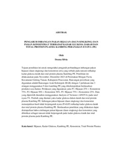 Desma, Silvia (2024) PENGARUH IMBANGAN PAKAN HIJAUAN (DAUN SINGKONG) DAN KONSENTRAT TERHADAP KADAR GLUKOSA DARAH DAN TOTAL PROTEIN PLASMA KAMBING PERANAKAN ETAWA (PE). FAKULTAS PERTANIAN, UNIVERSITAS LAMPUNG .