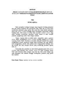 Bank merupakan lembaga keuangan yang bergerak di bidang pelayanan atau jasa melalui simpanan atau peminjaman uang. Maka dari itu, bank harus memberikan pelayanan yang nyaman dan aman atau biasa disebut pelayanan prima atau service excellent sehingga dapat membangun kepercayaan nasabah terhadap bank. Oleh karena itu setiap bank memiliki customer service yang selalu berusaha memberikan pelayanan terbaik karena ia akan menjadi jembatan penghubung antara bank dengan nasabah. Tujuan Laporan Akhir ini adalah untuk mengetahui peran customer service dalam meningkatkan service excellent terhadap nasabah di PT Bank Lampung Kantor Pusat. Penelitian ini bersifat deskriptif kualitatif dan penulis menggunakan metode wawancara kepada pihak perusahaan dan juga nasabah, serta menggunakan metode studi pustaka yaitu mengumpulkan berbagai teori dan literatur dari buku maupun internet yang mendukung penulisan laporan akhir ini. Kesimpulan dari penelitian ini yaitu bahwa pelayanan prima atau service excellent yang diberikan oleh customer service PT Bank Lampung Kantor Pusat telah termasuk dalam kategori yang baik dan telah sesuai dengan apa yang diharapkan oleh nasabah sehingga mendapatkan penilaian yang positif dari nasabah. Kata Kunci: Peran, customer service, service excellent