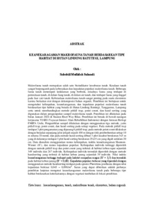 Makrofauna tanah merupakan salah satu bioindikator kesuburan tanah. Keadaan tanah sangat berpengaruh pada keberadaan dan kepadatan populasi makrofauna tanah. Beberapa fauna tanah menempati kedalaman yang berbeda, misalnya fauna yang terdapat di permukaan tanah, di dalam liang tanah, di dalam air tanah, dan terdapat fauna yang tinggal pada fase cair tanah. Keberadaan makrofauna tanah sangat penting pada suatu ekosistem karena berkaitan erat dengan dekomposisi bahan organik. Penelitian ini bertujuan untuk mengetahui kelimpahan, keanekaragaman, dan kepadatan populasi makrofauna tanah berdasarkan tipe habitat yang berada di Hutan Lindung Batutegi, Tanggamus, Lampung serta untuk membandingkan metode pitfall trap, point count, dan hand sorting yang digunakan dalam pengumpulan sampel makrofauna tanah. Penelitian ini dilakukan pada bulan Januari 2024 di Stasiun Riset Way Rilau. Penelitian ini berada di bawah naungan kerjasama YIARI (Yayasan Inisiasi Alam Rehabilitasi Indonesia) dengan Jurusan Biologi FMIPA Unila. Pengambilan sampel dilakukan dengan menggunakan tiga metode, yaitu pitfall trap, point count, dan hand sorting pada setiap vegetasi. Pada metode pitfall trap terdapat 3 plot pengamatan yang dipasang 6 pitfall trap, pada metode point count dilakukan dengan berjalan sepanjang jalur jelajah sejauh 100 m dengan titik pemberhentian setiap 10 m selama 10 menit, dan pada metode hand sorting dibuat 3 plot kuadrat berukuran 5x5 m yang di dalamnya terdapat 3 plot hand sorting berukuran 25x25 cm yang digali sedalam 20 cm. Data dianalisis menggunakan rumus kelimpahan, indeks keanekaragaman Shannon- Wiener (H`), dan rumus kepadatan populasi. Kelimpahan individu tertinggi diperoleh dengan metode pitfall trap dan point count yang terletak di habitat kebun rapat sejumlah 349 individu dan 247 individu. Kelimpahan individu terendah diperoleh dengan metode handsorting yang terletak di habitat kebun jarang sejumlah 39 individu. Nilai indeks keanekaragaman tertinggi terdapat pada habitat sempadan sungai (H’ = 3,5) dan terendah pada habitat kebun jarang (H’ = 0,68). Kepadatan populasi terbesar yang diperoleh dengan menggunakan metode handsorting terdapat pada spesies Pheretima posthuma dengan nilai kepadatan berkisar 0,045 – 0,098/m2 . Saran yang dapat diberikan adalah perlunya penelitian lanjutan mengenai keanekaragaman makrofauna tanah pada beberapa tipe habitat berdasarkan keterkaitannya dengan vegetasi tumbuhan di lokasi penelitian. Kata kunci : keanekaragaman, tanah, makrofauna tanah, ekosistem, bahan organik