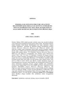 Diabetes Melitus (DM) adalah penyakit endokrin utama dan masalah kesehatan yang terjadi karena peningkatan kadar glukosa dalam tubuh. Pengobatan berbasis logam kompleks telah banyak dikembangkan dan dapat digunakan sebagai kandidat antidiabetes. Penelitian ini dilakukan dengan menambatkan molekul senyawa [Fe(cys)2], [Zn(cys)2], [Mn(cys)2], dan [Mg(cys)2] melalui studi molecular docking untuk mengetahui energi Gibbs senyawa kompleks terhadap protein target. Validasi native ligand menunjukkan hasil RMSD sebesar 1.818 Å dengan nilai docking sebesar -11.91 Kkal/mol. Senyawa [Fe(cys)2], [Zn(cys)2], [Mn(cys)2], dan [Mg(cys)2] menghasilkan skor docking secara berturut-turut sebesar -5.08; -5.48; -5.12; dan -5.37 Kkal/mol. Visualisasi 3D dengan software Discovery Studio Visualizer menunjukkan [Fe(cys)2] dengan skor docking lebih negatif dari senyawa pembanding Metformin (-2.77 Kkal/mol) memiliki jumlah kesamaan ikatan pada asam amino sisi aktif protein target dengan kontrol yaitu GLY14, TYR131, CYS17, ILE16, dan ARG18. Analisis dilanjutkan dengan uji Farmakokinetik dan Toksisitas untuk kandidat obat menggunakan metode in silico untuk menentukan kandungan senyawa sebagai kandidat obat antidiabetes tersebut secara Lipinski Rule of Five, Pre-ADME, dan Protox. Penelitian ini juga bertujuan memodelkan senyawa [Fe(cys)2], [Zn(cys)2], [Mn(cys)2], dan [Mg(cys)2] untuk mencari konformasi senyawa yang memiliki nilai IC50 terhadap enzim Low Molecule Weight Protein Tyrosine Phosphatase (LMW-PTP). Hasil yang pada penelitian ini menunjukkan bahwa [Fe(cys)2] dengan nilai Log IC50 perhitungan sebesar -2.07 atau nilai IC50 perhitungan sebesar 0.01 μ M berpotensi untuk dijadikan sebagai kandidat obat antidiabetes dalam menggantikan Metformin. Kata kunci: Antidiabetes, molecular docking, senyawa kompleks, QSAR Diabetes Mellitus (DM) is a major endocrine disease and health issue caused by elevated glucose levels in the body. Metal complex-based treatments have been extensively developed and can be used as antidiabetic candidates. This research involved docking molecules of the compounds [Fe(cys)2], [Zn(cys)2], [Mn(cys)2], dan [Mg(cys)2] through molecular docking studies to determine the Gibbs energy of the complex compounds against the target protein. Validation of the native ligand showed an RMSD result of 1.818 Å with a docking score of -11.91 Kcal/mol. The compounds [Fe(cys)2], [Zn(cys)2], [Mn(cys)2], dan [Mg(cys)2] produced docking scores of -5.08; -5.48; -5.12; and -5.37 Kcal/mol, respectively. 3D visualization using Discovery Studio Visualizer software showed that [Fe(cys)2] with a more negative docking score than the comparator compound Metformin (-2.77 Kcal/mol) had similar binding sites on the active site amino acids of the target protein, namely GLY14, TYR131, CYS17, ILE16, and ARG18. The analysis continued with pharmacokinetic and toxicity tests for the drug candidates using in silico methods to determine the compound content as antidiabetic drug candidates based on the Lipinski Rule of Five, Pre-ADME, and Protox. This study also aimed to model the compounds [Fe(cys)2], [Zn(cys)2], [Mn(cys)2], dan [Mg(cys)2] to find the conformation of the compounds that have an IC50 value against the enzyme Low Molecule Weight Protein Tyrosine Phosphatase (LMW-PTP). The results obtained are research shows that [Fe(cys)2] with a predicted Log IC50 value of -2.07 or a predicted IC50 value of 0.01 μM has the potential to be used as an antidiabetic drug candidate to replace Metformin. Keywords: Antidiabetic, molecular docking, complex compounds, QSAR