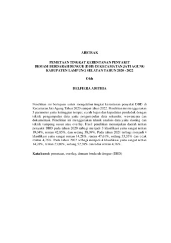 Delfiera, Adithia (2024) PEMETAAN TINGKAT KERENTANAN PENYAKIT DEMAM BERDARAH DENGUE (DBD) DI KECAMATAN JATI AGUNG KABUPATEN LAMPUNG SELATAN TAHUN 2020-2022. FAKULTAS KEGURUAN DAN ILMU PENDIDIKAN, UNIVERSITAS LAMPUNG.