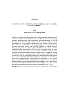 Beberapa rembesan hidrokarbon ditemukan di sekitar Cekungan Banyumas yang menandakan adanya sistem petroleum yang aktif. Namun, struktur geologi yang kompleks menjadi penyebab sulitnya menemukan cadangan minyak dan gas bumi di Cekungan Banyumas. Penelitian dengan metode gayaberat dilakukan untuk mendapatkan sub cekungan yang berpotensi hidrokarbon, melihat pola arah migrasi hidrokarbon dan mengidentifikasi pola struktur geologi bawah permukaan di Sub Cekungan Banyumas. Analisis data gayaberat dilakukan di sekitar Cekungan Banyumas yang terdiri atas analisis spektrum dan filter moving average, kemudian dilanjutkan dengan analisis vektor, analisis derivatif, pemodelan 2D dan 3D. Hasil analisis menunjukkan bahwa terdapat 6 sub cekungan yang berkorelasi dengan struktur sesar yang dapat di delineasi dengan kedalaman rata-rata yaitu 2.2 km dan pola tinggian di sekitar sub cekungan yang berperan sebagai jalur bermigrasinya hidrokarbon. Hasil pemodelan 2D dan 3D menunjukkan bahwa daerah penelitian tersusun atas endapan berusi kuarter sebagai lapisan permukaan dengan rata-rata densitas 2,2 gr/cc, lapisan dibawahnya merupakan Formasi Halang dengan rata-rata densitas 2,6 gr/cc, lapisan ketiga merupakan Formasi Penanjung dengan rata-rata densitas 2,45 gr/cc, lapisan keempat merupakan Formasi Gabon dengan rata-rata densitas 2,7 gr/cc. lapisan kelima merupakan sedimen Eosen dengan rata-rata densitas 2,75 gr/cc dan lapisan keenam merupakan batuan dasar (basement) dengan rata-rata densitas sebesar 3,0 gr/cc. Kata Kunci: analisis gayaberat, Cekungan Banyumas, pemodelan 2D, pemodelan 3D. Several hydrocarbon seepages were found around the Banyumas Basin indicating an active petroleum system. However, the complex geological structure is the cause of the difficulty in finding oil and gas reserves in the Banyumas Basin. Research using the gravity method was conducted to obtain sub-basins with hydrocarbon potential, to see the pattern of hydrocarbon migration direction and to identify the pattern of subsurface geological structure in the Banyumas Sub-Basin. Gravity data analysis was conducted around the Banyumas Basin consisting of spectrum analysis and moving average filter, then continued with vector analysis, derivative analysis, 2D and 3D modeling. The results of the analysis showed that there were 6 sub- basins that were blocked by fault structures that could be delineated at an average depth of 2.2 km and a height pattern around the sub-basins that acted as a path for hydrocarbon migration. The results of 2D and 3D modeling show that the research area is composed of quaternary sediments as a surface layer with an average density of 2.2 gr/cc, the layer below is the Halang Formation with an average density of 2.6 gr/cc, the third layer is the Penanjung Formation with an average density of 2.45 gr/cc, the fourth layer is the Gabon Formation with an average density of 2.7 gr/cc. The fifth layer is Eocene sediment with an average density of 2.75 gr/cc and the sixth layer is the basement with an average density of 3.0 gr/cc. Keywords: gravity analysis, Banyumas Basin, 2D modeling, 3D modeling.