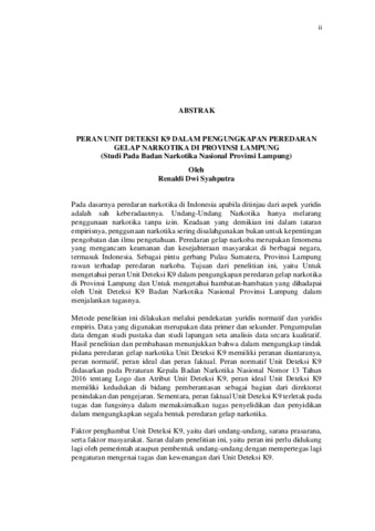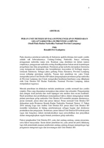 Pada dasarnya peredaran narkotika di Indonesia apabila ditinjau dari aspek yuridis adalah sah keberadaannya. Undang-Undang Narkotika hanya melarang penggunaan narkotika tanpa izin. Keadaan yang demikian ini dalam tataran empirisnya, penggunaan narkotika sering disalahgunakan bukan untuk kepentingan pengobatan dan ilmu pengetahuan. Peredaran gelap narkoba merupakan fenomena yang mengancam keamanan dan kesejahteraan masyarakat di berbagai negara, termasuk Indonesia. Sebagai pintu gerbang Pulau Sumatera, Provinsi Lampung rawan terhadap peredaran narkoba. Tujuan dari penelitian ini, yaitu Untuk mengetahui peran Unit Deteksi K9 dalam pengungkapan peredaran gelap narkotika di Provinsi Lampung dan Untuk mengetahui hambatan-hambatan yang dihadapai oleh Unit Deteksi K9 Badan Narkotika Nasional Provinsi Lampung dalam menjalankan tugasnya. Metode penelitian ini dilakukan melalui pendekatan yuridis normatif dan yuridis empiris. Data yang digunakan merupakan data primer dan sekunder. Pengumpulan data dengan studi pustaka dan studi lapangan seta analisis data secara kualitatif. Hasil penelitian dan pembahasan menunjukkan bahwa dalam mengungkap tindak pidana peredaran gelap narkotika Unit Deteksi K9 memiliki peranan diantaranya, peran normatif, peran ideal dan peran faktual. Peran normatif Unit Deteksi K9 didasarkan pada Peraturan Kepala Badan Narkotika Nasional Nomor 13 Tahun 2016 tentang Logo dan Atribut Unit Deteksi K9, peran ideal Unit Deteksi K9 memiliki kedudukan di bidang pemberantasan sebagai bagian dari direktorat penindakan dan pengejaran. Sementara, peran faktual Unit Deteksi K9 terletak pada tugas dan fungsinya dalam memaksimalkan tugas penyelidikan dan penyidikan dalam mengungkapkan segala bentuk peredaran gelap narkotika. Faktor penghambat Unit Deteksi K9, yaitu dari undang-undang, sarana prasarana, serta faktor masyarakat. Saran dalam penelitian ini, yaitu peran ini perlu didukung lagi oleh pemerintah ataupun pembentuk undang-undang dengan mempertegas lagi pengaturan mengenai tugas dan kewenangan dari Unit Deteksi K9. Renaldi Dwi Syahputra Selain itu,pentingnya faktor pendorong dari kerjasama antar sektor/lembaga penegak hukum maupun masyarakat sipil dalam mengentaskan peredaran gelap narkotika Kata Kunci : Unit Deteksi K9, Badan Narkotika Nasional, Peredaran Gelap Narkotika Basically, the circulation of narcotics in Indonesia from a juridical aspect is legal. The Narcotics Act only prohibits the use of narcotics without a license. In its empirical state, the use of narcotics is often misused not for the benefit of medicine and science. Illicit drug trafficking is a phenomenon that threatens the security and welfare of society in various countries, including Indonesia. As the gateway to Sumatra Island, Lampung Province is prone to drug trafficking. The purpose of this study, namely to find out the role of the K9 Detection Unit in disclosing illicit drug trafficking in Lampung Province and to find out the obstacles faced by the K9 Detection Unit of the Lampung Province National Narcotics Agency in carrying out its duties. This research method is conducted through normative juridical and empirical juridical approaches. The data used are primary and secondary data. Data collection by literature study and field study as well as qualitative data analysis. The results of the research and discussion show that in uncovering criminal acts of illicit drug trafficking the K9 Detection Unit has a role including, normative role, ideal role and factual role. The normative role of the K9 Detection Unit is based on the Regulation of the Head of the National Narcotics Agency Number 13 of 2016 concerning the Logo and Attributes of the K9 Detection Unit, the ideal role of the K9 Detection Unit has a position in the field of eradication as part of the directorate of prosecution and pursuit. Meanwhile, the factual role of the K9 Detection Unit lies in its duties and functions in maximizing the tasks of investigation and investigation in revealing all forms of illicit drug trafficking. The inhibiting factors, namely from the law, infrastructure, and community factors. Suggestions in this study, namely this role needs to be supported again by the government or legislators by emphasizing the regulation of the duties and authority of the K9 Detection Unit. In addition, the importance of encouraging factors from cooperation between sectors / law enforcement agencies and civil society in alleviating illicit drug trafficking. Keywords: K9 Detection Unit, National Narcotics Agency, Illicit Drug Trafficking