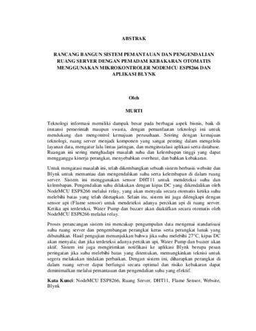 Murti , - (2024) RANCANG BANGUN SISTEM PEMANTAUAN DAN PENGENDALIAN RUANG SERVER DENGAN PEMADAM KEBAKARAN OTOMATIS MENGGUNAKAN MIKROKONTROLER NODEMCU ESP8266 DAN APLIKASI BLYNK. FAKULTAS TEKNIK, UNIVERSITAS LAMPUNG .