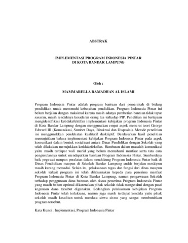 Mammarella, Ramadhan Al Islami (2024) IMPLEMENTASI PROGRAM INDONESIA PINTAR DI KOTA BANDAR LAMPUNG. Masters thesis, UNIVERSITAS LAMPUNG .
