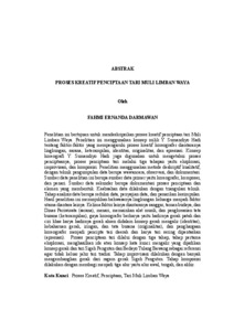 Penelitian ini bertujuan untuk mendeskripsikan proses kreatif penciptaan tari Muli Limban Waya. Penelitian ini menggunakan konsep milik Y. Sumandiyo Hadi tentang faktor-faktor yang mempengaruhi proses kreatif koreografer diantaranya lingkungan, sarana, keterampilan, identitas, originalitas, dan apresiasi. Konsep koreografi Y. Sumandiyo Hadi juga digunakan untuk mengetahui proses penciptaanya, proses penciptaan tari melalui tiga tahapan yaitu eksplorasi, improvisasi, dan komposisi. Penelitian menggunakan metode deskriptif kualitatif, dengan teknik pengumpulan data berupa wawancara, observasi, dan dokumentasi. Sumber data penelitian ini berupa sumber data primer yaitu koreografer, komposer, dan penari. Sumber data sekunder berupa dokumentasi proses penciptaan dan elemen yang membentuk. Keabsahan data dilakukan dengan triangulasi teknik. Tahap analisis data berupa reduksi data, penyajian data, dan penarikan kesimpulan. Hasil penelitian ini menunjukkan bahwasanya lingkungan keluarga menjadi faktor utama diantara lainya. Kelima faktor lainya diantaranya sanggar, taman budaya, dan Dinas Pariwisata (sarana), menari, memainkan alat musik, dan pengkreasian tata busana (keterampilan), gaya koreografer berkarya yaitu hadirnya gerak patah dan ciri khas karya hadirnya gerak aksen didalam konsep gerak mengalir (identitas), kebaharuan gerak, iringan, dan tata busana (originalitas), dan penghargaan koreografer menjadi pencipta tari daerah dan karya tari sering dipentaskan (apresiasi). Proses penciptaan tari dilalui dengan tiga tahap, tahap pertama eksplorasi, menghasilkan ide atau konsep kata kunci mengalir yang dijadikan konsep gerak dan tari Sigeh Penguten dan Bedayo Tulang Bawang sebagai referensi agar tidak keluar jalur tari tradisi. Tahap improvisasi dilakukan dengan banyak mengembangkan gerak dari ragam gerak Sigeh Penguten. Tahap komposisi dilakukan dengan membagi menjadi tiga alur yaitu alur awal, tengah, dan akhir. Kata Kunci : Proses Kreatif, Penciptaan, Tari Muli Limban Waya This study aims to describe how the Muli Limban Waya dance was created. The research used Y. Sumandiyo Hadi's ideas about what affects choreographers' creative processes, like the environment, resources, skills, identity, originality, and appreciation. Y. Sumandiyo Hadi's ideas about choreography were also used to understand the creation process, which involves three stages: exploration, improvisation, and composition. The research used a qualitative descriptive method. Information was collected through interviews, observations, and documentation. The main sources of information were the choreographer, composer, and dancers. Additional information was collected from documents about the creation process. The information was checked using several methods. The data was analyzed by reducing it, presenting it, and drawing conclusions. The research showed that the family environment was the most important factor, followed by factors like dance studios, cultural centers, and the Department of Tourism (facilities). The skills needed were dancing, playing musical instruments, and creating costumes. The choreographer's unique style involved distinct movements and using accentuated movements within flowing movements. Original ideas were shown through new movements, music, and costumes. Choreographers were recognized for creating regional dances, and their dances were often performed. The creation process involved three stages: exploration to generate ideas and the concept of flowing movements, improvisation to develop movements, and composition to organize the process into a beginning, middle, and end. Key Word : Creative Process, Creation, Muli Limban Waya Dance