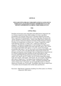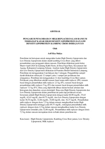 Arif , Eka Mulya (2024) PENGARUH PENAMBAHAN MILK REPLACER DALAM RANSUM TERHADAP KADAR HIGH DENSITY LIPOPROTEIN DAN LOW DENSITY LIPOPROTEIN KAMBING CROSS BOER JANTAN. FAKULTAS PERTANIAN, UNIVERSITAS LAMPUNG .
