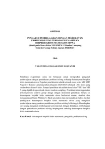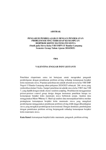 VALENTINA ENGGAR INDY, LESTANTI (2025) PENGARUH PEMBELAJARAN DENGAN PENDEKATAN PROBLEM SOLVING TERHADAP KEMAMPUAN BERPIKIR KRITIS MATEMATIS SISWA (Studi pada Siswa Kelas VIII SMPN 15 Bandar Lampung Semester Genap Tahun Ajaran 2024/2025). FAKULTAS KEGURUAN DAN ILMU PENDIDIKAN, UNIVERSITAS LAMPUNG .