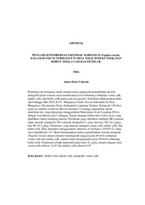 Anisa Putri, Cahyati (2025) Pengaruh Pemberian ekstrak marigold (Tegates erecta) Dalam Ransum Terhadap Warna Yolk, Indeks Yolk dan Bobot Yolk Ayam Ras Petelur. Fakultas Pertanian, Universitas Lampung.