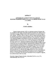 Oligosakarida alginat (OSA) merupakan hasil hidrolisis dari alginat yang memiliki potensi aktivitas antioksidan lebih tinggi. Aktivitas radikal bebas dalam tubuh yang berlebihan dapat memicu stres oksidatif yang akan menyebabkan penyakit degeneratif. Maka diperlukannya upaya untuk menemukan sumber antioksidan alami yang efektif sebagai alternatif dalam mencegah terjadinya stres oksidatif. Penelitian ini bertujuan untuk mengetahui aktivitas antioksidan alginat dan OSA secara in vitro menggunakan metode 2,2-difenil-1 pikrilhidrazil (DPPH), serta menguji pengaruh terhadap kadar malondialdehid (MDA) plasma darah mencit secara in vivo. OSA diperoleh dengan mengestraksi Sargassum sp. menjadi alginat dilanjutkan depolimerisasi dengan aktivitas enzimatis dari bakteri Bacillus cereus, uji aktivitas antioksidannya menggunakan metode DPPH hingga didapatkan nilai inhibisi, dilanjutkan pengujian Inhibition Concentration 50 (IC50) dan kadar MDA sebagai indikator adanya kerusakan akibat radikal bebas. Hasil uji in vitro menunjukkan bahwa baik alginat maupun OSA memiliki aktivitas antioksidan yang sangat lemah dengan nilai IC50 sebesar 2557 ppm dan 1041 ppm. Uji in vivo memperlihatkan bahwa rerata kadar MDA pada beberapa kelompok perlakuan mengalami penurunan, namun hasil analisis statistik menunjukkan tidak ada perbedaan nyata (P>0,05). Berdasarkan hasil tersebut, OSA memiliki aktivitas antioksidan yang lebih baik dibandingkan dengan alginat namun efektivitasnya masih sangat lemah.