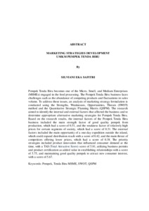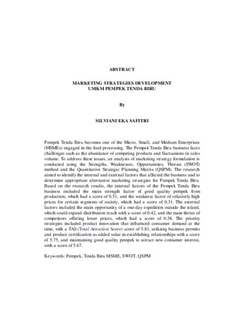 Pempek Tenda Biru becomes one of the Micro, Small, and Medium Enterprises (MSMEs) engaged in the food processing. The Pempek Tenda Biru business faces challenges such as the abundance of competing products and fluctuations in sales volume. To address these issues, an analysis of marketing strategy formulation is conducted using the Strengths, Weaknesses, Opportunities, Threats (SWOT) method and the Quantitative Strategic Planning Matrix (QSPM). The research aimed to identify the internal and external factors that affected the business and to determine appropriate alternative marketing strategies for Pempek Tenda Biru. Based on the research results, the internal factors of the Pempek Tenda Biru business included the main strength factor of good quality pempek from production, which had a score of 0.51, and the weakness factor of relatively high prices for certain segments of society, which had a score of 0.31. The external factors included the main opportunity of a one-day expedition outside the island, which could expand distribution reach with a score of 0.42, and the main threat of competitors offering lower prices, which had a score of 0.38. The priority strategies included product innovation that influenced consumer demand at the time, with a TAS (Total Attractive Score) score of 5.81, utilizing business permits and product certification as added value in establishing relationships with a score of 5.75, and maintaining good quality pempek to attract new consumer interest, with a score of 5.67. Keywords: Pempek, Tenda Biru MSME, SWOT, QSPM Pempek Tenda Biru menjadi salah satu Usaha, Mikro, Kecil, dan Menengah (UMKM) yang bergerak di industri pengolahan. Usaha Pempek Tenda Biru menghadapi tantangan seperti banyaknya produk pesaing sejenis, dan fluktuasi volume penjualan. Upaya mengatasi permasalahan tersebut, dilakukan analisis perumusan strategi pemasaran dengan menggunakan metode Strengths, Weaknesses, Opportunities, Threats (SWOT) dan Quantitative Strategic Planning Matrix (QSPM). Penelitian bertujuan untuk mengidentifikasi faktor-faktor internal dan eksternal yang mempengaruhi usaha dan menentukan alternatif strategi pemasaran yang tepat pada usaha Pempek Tenda Biru. Berdasarkan hasil penelitian didapatkan faktor internal usaha produk pempek tenda biru yaitu faktor kekuatan utama kualitas pempek yang baik dari hasil produksi dengan skor sebesar 0,51, dan faktor kelemahan harga yang relatif mahal bagi beberapa kalangan masyarakat dengan skor 0,31. Faktor eksternal yaitu peluang utama ekspedisi keluar pulau dalam satu hari dapat memperluas jangkauan distribusi dengan skor 0,42 dan ancaman utama harga yang ditawarkan kompetitor lebih murah dengan skor 0,38. Prioritas strategi yaitu melakukan inovasi produk yang mempengaruhi permintaan konsumen terkini dengan skor TAS (Total Attractive Score) 5,81, pemanfaatan izin usaha dan sertifikasi produk sebagai nilai tambah dalam menjalin dengan nilai 5,75, dan mempertahankan kualitas pempek yang baik untuk menarik minat konsumen baru 5,67. Kata kunci: SWOT, Pempek, UMKM Pempek Tenda Biru, QSPM.