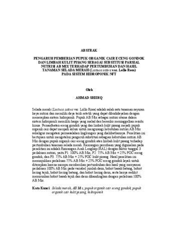 Selada merah (Lactuca sativa var. Lollo Rosa) adalah salah satu tanaman sayuran kaya nutrisi dan memiliki daya tarik estetik yang dapat dibudidayakan dengan menerapkan sistem hidroponik. Pupuk AB Mix sebagai nutrisi utama dalam sistem hidroponik memiliki harga yang mahal dan beresiko meninggalkan residu kimia. Pemanfaatan eceng gondok yang dan limbah kulit pisang mejadi pupuk organik cair dapat menjadi solusi untuk mengurangi kebutuhan nutrisi AB Mix sekaligus mengatasi permasalahan lingkungan yang diakibatkannya. Penelitian ini bertujuan untuk mengetahui pengaruh substitusi sebagian kebutuhan nutrisi AB Mix dengan pupuk organik cair eceng gondok atau limbah kulit pisang terhadap pertumbuhan tanaman selada merah. Rancangan percobaan yang digunakan pada penelitian ini adalah Rancangan Acak Lengkap (RAL) dengan faktor tunggal 3 perlakuan nutrisi, yaitu P1: 100% AB Mix, P2: 75% AB Mix + 25% POC eceng gondok, dan P3: 75% AB Mix + 25% POC kulit pisang. Hasil penelitian ini menunjukkan perlakuan 75% AB Mix + 25% POC eceng gondok layak untuk diterapkan karena mampu memberikan pertumbuhan dan hasil yang menyamai perlakuan 100% AB Mix pada variabel jumlah daun, bobot basah batang, bobot kering tajuk, bobot kering batang, dan bobot kering daun, serta hanya sedikit menurunkan bobot basah tajuk dan daun dibandingkan dengan perlakuan 100% AB Mix. Kata Kunci : Selada merah, AB Mix, pupuk organik cair eceng gondok, pupuk organik cair kulit pisang, hidroponik