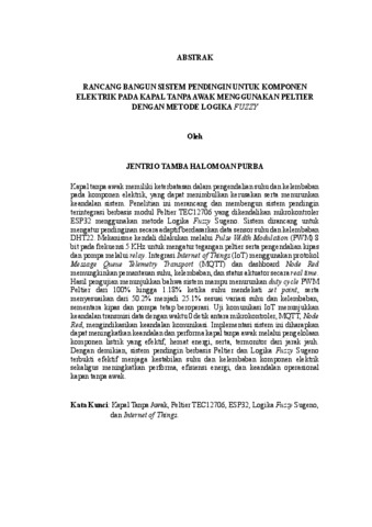 Kapal tanpa awak memiliki keterbatasan dalam pengendalian suhu dan kelembaban pada komponen elektrik, yang dapat menimbulkan kerusakan serta menurunkan keandalan sistem. Penelitian ini merancang dan membengun sistem pendingin terintegrasi berbasis modul Peltier TEC12706 yang dikendalikan mikrokontroler ESP32 menggunakan metode Logika Fuzzy Sugeno. Sistem dirancang untuk mengatur pendinginan secara adaptif berdasarkan data sensor suhu dan kelembaban DHT22. Mekanisme kendali dilakukan melalui Pulse Width Modulation (PWM) 8 bit pada frekuensi 5 KHz untuk mengatur tegangan peltier serta pengendalian kipas dan pompa melalui relay. Integrasi Internet of Things (IoT) menggunakan protokol Message Queue Telemetry Transport (MQTT) dan dashboard Node Red memungkinkan pemantauan suhu, kelembaban, dan status aktuator secara real time. Hasil pengujian menunjukkan bahwa sistem mampu menurunkan duty cycle PWM Peltier dari 100% hingga 1.18% ketika suhu mendekati set point, serta menyesuaikan dari 50.2% menjadi 25.1% sesuai variasi suhu dan kelembaban, sementara kipas dan pompa tetap beroperasi. Uji komunikasi IoT menunjukkan keandalan transmisi data dengan waktu 0 detik antara mikrokontroler, MQTT, Node Red, mengindikasikan keandalan komunikasi. Implementasi sistem ini diharapkan dapat meningkatkan keandalan dan performa kapal tanpa awak melalui pengelolaan komponen listrik yang efektif, hemat energi, serta, termonitor dari jarak jauh. Dengan demikian, sistem pendingin berbasis Peltier dan Logika Fuzzy Sugeno terbukti efektif menjaga kestabilan suhu dan kelembaban komponen elektrik sekaligus meningkatkan performa, efisiensi energi, dan keandalan operasional kapan tanpa awak.