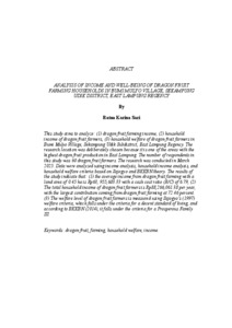 Penelitian ini bertujuan untuk menganalisis: (1) pendapatan usahatani buah naga, (2) pendapatan rumah tangga petani buah naga, (3) kesejahteraan rumah tangga petani buah naga di Desa Bumi Mulyo Kecamatan Sekampung Udik Kabupaten Lampung Timur. Lokasi penelitian dipilih secara sengaja dengan pertimbangan bahwa lokasi ini merupakan salah satu wilayah yang memnghasilkan produksi buah naga terbesar di Lampung Timur. Jumlah responden dalam penelitian ini adalah 60 petani buah naga. Penelitian dilakukan pada Maret 2025. Data dianalisis menggunakan analisis pendapatan, analisis pendapatan rumah tangga, dan kriteria kesejahteraan rumah tangga berdasarkan teori Sajogyo dan BKKBN. Hasil penelitian menunjukkan bahwa : (1) rata-rata pendapatan usahatani buah naga dengan luas lahan 0,45 ha sebesar Rp63.955.683,33 dengan R/C atas biaya tunai sebesar 6,79, (2) Total pendapatan rumah tangga petani buahn naga adalah Rp88.266,061,38 per tahun dengan kontribusi terbesar berasal dari usahatani buah naga yaitu sebesar 72,46 persen. (3) Tingkat kesejahteraan petani petani buah diukur menggunakan kriteria kesejahteraan Sajogyo (1997) termasuk dalam kriteria hidup layak dan berdasarkan BKKBN (2014) termasuk dalam kriteria Keluarga Sejahtera III. Kata kunci : buah naga, kesejahteraan rumah tangga, pendapatan, usahatani. This study aims to analyze: (1) dragon fruit farming income, (2) household income of dragon fruit farmers, (3) household welfare of dragon fruit farmers in Bumi Mulyo Village, Sekampung Udik Subdistrict, East Lampung Regency. The research location was deliberately chosen because it is one of the areas with the highest dragon fruit production in East Lampung. The number of respondents in this study was 60 dragon fruit farmers. The research was conducted in March 2025. Data were analyzed using income analysis, household income analysis, and household welfare criteria based on Sajogyo and BKKBN theory. The results of the study indicate that: (1) the average income from dragon fruit farming with a land area of 0.45 ha is Rp63, 955,683.33 with a cash cost ratio (R/C) of 6.79, (2) The total household income of dragon fruit farmers is Rp88,266,061.38 per year, with the largest contribution coming from dragon fruit farming at 72.46 percent. (3) The welfare level of dragon fruit farmers is measured using Sajogyo's (1997) welfare criteria, which falls under the criteria for a decent standard of living, and according to BKKBN (2014), it falls under the criteria for a Prosperous Family III. Keywords: dragon fruit, farming, household welfare, income.