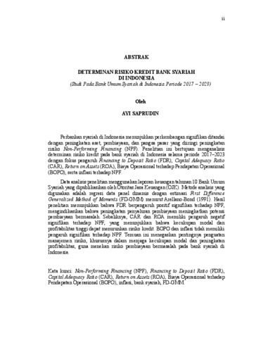 Perbankan syariah di Indonesia menunjukkan perkembangan signifikan ditandaidengan peningkatan aset, pembiayaan, dan pangsa pasar yang diiringi peningkatan risiko Non-Performing Financing (NPF). Penelitian ini bertujuan menganalisis determinan risiko kredit pada bank syariah di Indonesia selama periode 2017–2023dengan fokus pengaruh Financing to Deposit Ratio (FDR), Capital Adequacy Ratio(CAR), Return on Assets (ROA), Biaya Operasional terhadap Pendapatan Operasional(BOPO), serta inflasi terhadap NPF. Data analisis penelitian menggunakan laporan keuangan tahunan 10 Bank Umum Syariah yang dipublikasikan oleh Otoritas Jasa Keuangan (OJK). Metode analisis yang digunakan adalah regresi data panel dinamis dengan estimasi First DifferenceGeneralized Method of Moments (FD-GMM) menurut Arellano-Bond (1991). Hasil penelitian menunjukkan bahwa FDR berpengaruh positif signifikan terhadap NPF, mengindikasikan bahwa peningkatan penyaluran pembiayaan meningkatkan potensipembiayaan bermasalah. Sebaliknya, CAR dan ROA memiliki pengaruh negatifsignifikan terhadap NPF, yang menunjukkan bahwa kecukupan modal dan profitabilitas tinggi dapat menurunkan risiko kredit. BOPO dan inflasi tidak memilikipengaruh signifikan terhadap NPF. Temuan ini menegaskan pentingnya penguatan manajemen risiko, khususnya dalam menjaga kecukupan modal dan peningkatan profitabilitas, guna menekan risiko pembiayaan bermasalah pada bank syariah di Indonesia. Kata kunci: Non-Performing Financing (NPF), Financing to Deposit Ratio (FDR),Capital Adequacy Ratio (CAR), Return on Assets (ROA), Biaya Operasional terhadap Pendapatan Operasional (BOPO), inflasi, bank syariah, FD-GMM. Islamic banking in Indonesia has shown significant growth, marked by increases in assets,financing, and market share, accompanied by an increase in the risk of Non-Performing Financing (NPF). This study aims to analyze the determinants of credit risk in Islamic banksin Indonesia during the 2017–2023 period, focusing on the influence of the Financing to Deposit Ratio (FDR), Capital Adequacy Ratio (CAR), Return on Assets (ROA), OperatingExpenses to Operating Income (BOPO), and inflation on NPF. The research analysis data uses the annual financial reports of 10 Islamic Commercial Banks published by the FinancialServices Authority (OJK). The analytical method used is dynamic panel data regression with First Difference Generalized Method of Moments (FD-GMM) estimation according to Arellano-Bond (1991). The results show that FDR has a significant positive effect on NPF, indicating that increased financing disbursement increases the potential for non-performing financing. Conversely, CAR and ROA have a significant negative effect on NPF, indicating that capital adequacy and high profitability can reduce credit risk. BOPO and inflation did not significantly affect NPF. This finding underscores the importance of strengthening risk management, particularly in maintaining capital adequacy and increasing profitability, to reduce the risk of non-performing financing in Islamic banks in Indonesia. Keywords: Non-Performing Financing (NPF), Financing to Deposit Ratio (FDR), CapitalAdequacy Ratio (CAR), Return on Assets (ROA), Operating Expenses to Operating Income (BOPO), inflation, Islamic banks, FD-GMM.