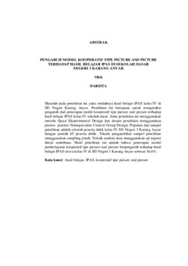 Masalah pada penelitian ini yaitu rendahnya hasil belajar IPAS kelas IV di SD Negeri Karang Anyar. Penelitian ini bertujuan untuk mengetahui pengaruh dari penerapan model kooperatif tipe picture and picture terhadap hasil belajar IPAS kelas IV sekolah dasar. Jenis penelitian ini menggunakan metode Quasi Eksperimental Design dan desain penelitian menggunakan pretest- posttest Nonequivalent Control Group Design. Populasi dan sampel penelitian adalah seluruh peserta didik kelas IV SD Negeri 3 Karang Anyar dengan jumlah 65 peserta didik. Teknik pengambilan sampel penelitian menggunakan sampling jenuh. Teknik analisis data menggunakan uji regresi linear sederhana. Hasil penelitian ini adalah bahwa penerapan model pembelajaran kooperatif tipe picture and picture berpengaruh terhadap hasil belajar IPAS siswa kelas IV di SD Negeri 3 Karang Anyar sebesar 56,6%. Kata kunci : hasil belajar, IPAS, kooperatif tipe picture and picture
