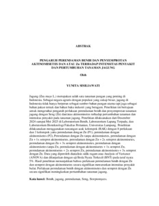 Jagung (Zea mays L.) merupakan salah satu tanaman pangan yang penting di Indonesia. Sebagai negara agraris dengan populasi yang cukup besar, jagung di Indonesia tidak hanya berperan sebagai sumber bahan pangan utama tapi juga sebagai bahan pakan ternak dan bahan baku industri yang beragam. Penelitian ini bertujuan untuk mengetahui pengaruh perlakuan perendaman benih dan penyemprotan tanaman jagung dengan Seng (Zn) dan/atau aktinomisetes terhadap pertumbuhan tanaman dan intensitas penyakit pada tanaman jagung. Penelitian dilaksanakan dari Desember 2024 sampai Mei 2025 di Laboratorium Benih, Laboratorium Lapang Terpadu, dan Laboratorium Bioteknologi Fakultas Pertanian, Universitas Lampung. Penelitian dilaksanakan menggunakan rancangan acak kelompok (RAK) dengan 8 perlakuan dan 3 kelompok yaitu perendaman dengan Zn (P1), perendaman dengan aktinomisetes (P2), Perendaman dengan Zn tanpa aktinomisetes, perendaman dengan Zn + 1x semprot aktinomisetes, perendaman dengan Zn + 2x semprot aktinomisetes, perendaman dengan Zn + 3x semprot aktinomisetes, perendaman dengan aktinomisetes tanpa Zn, perendaman dengan aktinomisetes + 1x semprot Zn, perendaman aktinomisetes + 2x semprot Zn, perendaman aktinomisetes + 3x semprot dengan Zn. Data yang diperoleh dianalisis sidik ragam atau Analysis of Variance (ANOVA) dan dilanjutkan dengan uji Beda Nyata Terkecil (BNT) pada taraf nyata 5%. Hasil penelitian menunjukkan bahwa perlakuan perendaman benih dengan Zn dan semprot dengan aktinomisetes secara signifikan menurunkan intensitas penyakit bulai. Perlakuan perendaman benih dengan aktinomisetes dan semprot dengan Zn secara signifikan meningkatkan pertumbuhan tanaman jagung.