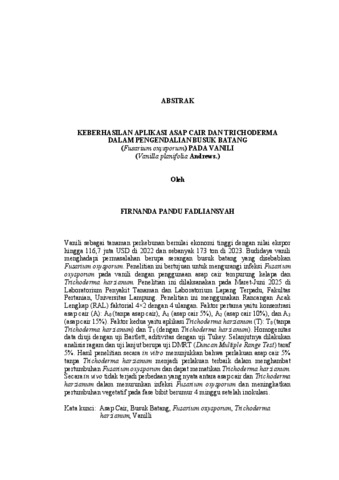 Firnanda Pandu , Fadliansyah (2025) Keberhasilan Aplikasi Asap Cair dan Trichoderma dalam Pengendalian Busuk Batang (Fusarium oxysporum) pada Vanili (Vanilla planifolia Andrews.). FAKULTAS PERTANIAN, UNIVERSITAS LAMPUNG.