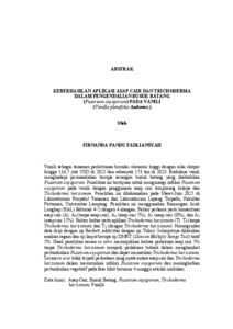 Vanili sebagai tanaman perkebunan bernilai ekonomi tinggi dengan nilai ekspor hingga 116,7 juta USD di 2022 dan sebanyak 173 ton di 2023. Budidaya vanili menghadapi permasalahan berupa serangan busuk batang yang disebabkan Fusarium oxysporum. Penelitian ini bertujuan untuk mengurangi infeksi Fusarium oxysporum pada vanili dengan penggunaan asap cair tempurung kelapa dan Trichoderma harzianum. Penelitian ini dilaksanakan pada Maret-Juni 2025 di Laboratorium Penyakit Tanaman dan Laboratorium Lapang Terpadu, Fakultas Pertanian, Universitas Lampung. Penelitian ini menggunakan Rancangan Acak Lengkap (RAL) faktorial 4×2 dengan 4 ulangan. Faktor pertama yaitu konsentrasi asap cair (A): A0 (tanpa asap cair), A1 (asap cair 5%), A2 (asap cair 10%), dan A3 (asap cair 15%). Faktor kedua yaitu aplikasi Trichoderma harzianum (T): T0 (tanpa Trichoderma harzianum) dan T1 (dengan Trichoderma harzianum). Homogenitas data diuji dengan uji Bartlett, aditivitas dengan uji Tukey. Selanjutnya dilakukan analisis ragam dan uji lanjut berupa uji DMRT (Duncan Multiple Range Test) taraf 5%. Hasil penelitian secara in vitro menunjukkan bahwa perlakuan asap cair 5% tanpa Trichoderma harzianum menjadi perlakuan terbaik dalam menghambat pertumbuhan Fusarium oxysporum dan dapat mematikan Trichoderma harzianum. Secara in vivo tidak terjadi perbedaan yang nyata antara asap cair dan Trichoderma harzianum dalam menurunkan infeksi Fusarium oxysporum dan meningkatkan pertumbuhan vegetatif pada fase bibit berumur 4 minggu setelah inokulasi. Vanilla is a high-value plantation crop with export earnings reaching USD 116.7 million in 2022 and a production volume of 173 tons in 2023. Vanilla cultivation faces significant challenges from stem rot disease caused by Fusarium oxysporum. This study aimed to reduce Fusarium oxysporum infection in vanilla through the application of coconut shell liquid smoke and Trichoderma harzianum. The research was conducted from March to June 2025 at the Plant Disease Laboratory and Integrated Field Laboratory, Faculty of Agriculture, University of Lampung. A factorial Completely Randomized Design (CRD) 4×2 with four replications was employed. The first factor was liquid smoke concentration (A): A0 (no liquid smoke), A1 (5% liquid smoke), A2 (10% liquid smoke), and A3 (15% liquid smoke). The second factor was the application of Trichoderma harzianum (T): T0 (without Trichoderma harzianum) and T1 (with Trichoderma harzianum). Data homogeneity was tested using Bartlett’s test, and additivity was assessed with Tukey’s test. Subsequently, analysis of variance (ANOVA) and Duncan’s Multiple Range Test (DMRT) at the 5% significance level were performed. In vitro results indicated that treatment with 5% liquid smoke without Trichoderma harzianum was the most effective in inhibiting the growth of Fusarium oxysporum but also had a lethal effect on Trichoderma harzianum. In vivo, there was no significant difference between liquid smoke and Trichoderma harzianum in reducing Fusarium oxysporum infection and enhancing vegetative growth at the seedling stage 4 weeks after inoculation.