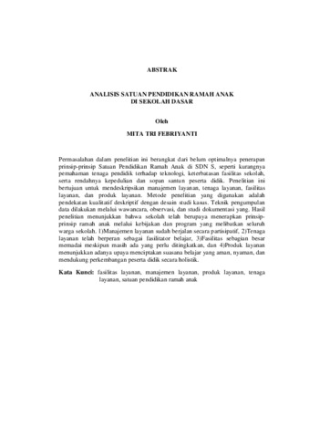Permasalahan dalam penelitian ini berangkat dari belum optimalnya penerapan prinsip-prinsip Satuan Pendidikan Ramah Anak di SDN S, seperti kurangnya pemahaman tenaga pendidik terhadap teknologi, keterbatasan fasilitas sekolah, serta rendahnya kepedulian dan sopan santun peserta didik. Penelitian ini bertujuan untuk mendeskripsikan manajemen layanan, tenaga layanan, fasilitas layanan, dan produk layanan. Metode penelitian yang digunakan adalah pendekatan kualitatif deskriptif dengan desain studi kasus. Teknik pengumpulan data dilakukan melalui wawancara, observasi, dan studi dokumentasi yang. Hasil penelitian menunjukkan bahwa sekolah telah berupaya menerapkan prinsip prinsip ramah anak melalui kebijakan dan program yang melibatkan seluruh warga sekolah. 1)Manajemen layanan sudah berjalan secara partisipatif, 2)Tenaga layanan telah berperan sebagai fasilitator belajar, 3)Fasilitas sebagian besar memadai meskipun masih ada yang perlu ditingkatkan, dan 4)Produk layanan menunjukkan adanya upaya menciptakan suasana belajar yang aman, nyaman, dan mendukung perkembangan peserta didik secara holistik. Kata Kunci: fasilitas layanan, manajemen layanan, produk layanan, tenaga layanan, satuan pendidikan ramah anak The problems in this study came from the less-than-optimal implementation of the principles of Child-Friendly Education Units at SDN S, such as the lack of understanding of educators regarding technology, limited school facilities, and low concern and politeness of students. This study aimed to describe service management, service personnel, service facilities, and service products. The research method used was a descriptive qualitative approach with a case study design. Data collection techniques were carried out through interviews, observations, and documentation studies. The results of the study showed that the school made efforts to implement child-friendly principles through policies and programs that involved the entire school community. 1) Service management was carried out in a participatory manner, 2) Service personnel acted as learning facilitators, 3) Facilities were mostly adequate although there were still some that needed to be improved, and 4) Service products showed efforts to create a safe, comfortable learning atmosphere that supported the holistic development of students. Keywords: service facilities, service management, service products, service personnel, child-friendly education units