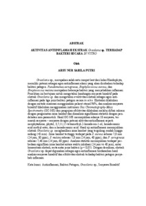 Gracilaria sp., merupakan salah satu rumput laut dari kelas Rhodophyta, memiliki potensi sebagai agen antiinflamasi alami yang akan dicobakan terhadap bakteri patogen. Pseudomonas aeruginosa, Staphylococcus aureus, dan Streptococcus mutans merupakan beberapa bakteri yang menyebabkan inflamasi. Penelitian ini bertujuan untuk mengetahui kandungan senyawa bioaktif pada ekstrak Gracilaria sp. dan mengetahui evektivitas ekstrak sebagai agen antiinflamasi pada tiga jenis bakteri patogen secara in vitro. Ekstraksi dilakukan dengan metode maserasi menggunakan pelarut etanol 96%, dan analisis senyawa bioaktif dilakukan menggunakan instrumen Gas Chromatography-Mass Spectrometry (GC-MS) dan pengujian efektivitas dilakukan melalui difusi cakram dengan pengamatan zona hambat dan dianalisis signifikansi statistik dengan pen dekatan non-parametrik. Hasil GC-MS menunjukkan adanya 18 senyawa, termasuk senyawa – senyawa dengan potensi aktivitas antiinflamasi seperti neophytadiene, phytol, 3,7,11,15-tetramethyl-2-hexadecen-1-ol, hexadecanoic acid methyl ester, dan n-hexadecanoic acid. Hasil uji antiinflamasi menunjukkan ekstrak Gracilaria sp. menghasilkan zona hambat yang tergolong rendah hingga sedang (<8 mm). Zona hambat tertinggi terdapat pada S. aureus sebesar 7,8 mm (24 jam, 30 ppm), S. mutans sebesar 7,8 mm (24 jam, 40 ppm), dan P. aeruginosa sebesar 7,46 mm (24 jam, 60 ppm). Analisis statistik menunjukkan terdapat perbedaan signifikan zona hambat antara waktu inkubasi (24 jam vs 48 jam), antar konsentrasi ekstrak, serta antar jenis bakteri (p < 0,05). Dengan demikian, ekstrak Gracilaria sp. dapat digunakan sebagai agen antiinflamasi berdasarkan hasil analisis senyawa bioaktif dan efektivitas ekstrak terhadap bakteri patogen penyebab inflamasi.