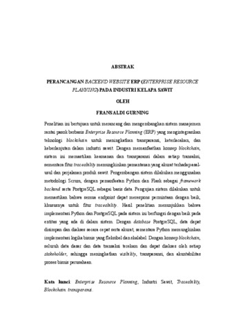Penelitian ini bertujuan untuk merancang dan mengembangkan sistem manajemen rantai pasok berbasis Enterprise Resource Planning (ERP) yang mengintegrasikan teknologi blockchain untuk meningkatkan transparansi, keterlacakan, dan keberlanjutan dalam industri sawit. Dengan memanfaatkan konsep blockchain, sistem ini memastikan keamanan dan transparansi dalam setiap transaksi, sementara fitur traceability memungkinkan pemantauan yang akurat terhadap asal- usul dan perjalanan produk sawit. Pengembangan sistem dilakukan menggunakan metodologi Scrum, dengan pemanfaatan Python dan Flask sebagai framework backend serta PostgreSQL sebagai basis data. Pengujian sistem dilakukan untuk memastikan bahwa semua endpoint dapat merespons permintaan dengan baik, khususnya untuk fitur traceability. Hasil penelitian menunjukkan bahwa implementasi Python dan PostgreSQL pada sistem ini berfungsi dengan baik pada entitas yang ada di dalam sistem. Dengan database PostgreSQL, data dapat disimpan dan diakses secara cepat serta akurat, sementara Python memungkinkan implementasi logika bisnis yang fleksibel dan skalabel. Dengan konsep blockchain, seluruh data dasar dan data transaksi terekam dan dapat diakses oleh setiap stakeholder, sehingga meningkatkan visibility, transparansi, dan akuntabilitas proses bisnis perusahaan. Kata kunci: Enterprise Resource Planning, Industri Sawit, Traceability, Blockchain. transparansi. This research aims to design and develop a supply chain management system based on Enterprise Resource Planning (ERP) that integrates blockchain technology to enhance transparency, traceability, and sustainability in the palm oil industry. By utilizing blockchain concept, the system ensures security and transparency in every transaction, while the traceability feature allows accurate monitoring of the origin and journey of palm oil products. The system development is carried out using the Scrum methodology, with Python and Flask as the backend framework and PostgreSQL as the database. System testing is conducted to ensure that all endpoints respond properly, particularly for the traceability feature. The results of this research indicate that the implementation of Python and PostgreSQL in the system functions well within the existing entities. With PostgreSQL, data can be stored and accessed quickly and accurately, while Python allows the implementation of flexible and scalable business logic. With the blockchain concept, all basic data and transaction data are recorded and accessible by every stakeholder, thus improving visibility, transparency, and accountability in the company's business processes. Keywords: Enterprise Resource Planning, Palm Oil Industry, Traceability, Blockchain, Transparency.