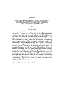 Kepercayaan merupakan salah satu bentuk modal sosial petani terhadap penyuluh pertanian lapangan (PPL). Petani akan memberikan kepercayaan apabila informasi yang disampaikan sesuai dengan kondisi nyata di lapangan. Namun, rendahnya kepercayaan sering menjadi penyebab penolakan inovasi yang ditawarkan oleh PPL. Tujuan dari penelitian untuk mengetahui tingkat kepercayaan petani terhadap PPL, menganalisis faktor-faktor yang berhubungan dengan tingkat kepercayaan petani terhadap PPL, dan mengetetahui hubungan kepercayaan petani terhadap penyuluh dengan keikutsertaan petani dalam mengikuti kegitan penyuluhan. Penentuan lokasi penelitian dilakukan secara sengaja (purposive). Responden penelitian ini 72 orang petani yang tersebar di 11 desa yang ada di Kecamatan Sumberejo. Analisis data yang digunakan yaitu deskiprif kuantitatif dan uji hubungan Rank Spearman. Tingkat kepercayaan petani padi di kecamatan sumberejo terhadap PPL tergolong sedang dan terdapat hubungan yang positif dan signifikan yaitu pengalaman pribadi (X1), persepsi (X2), teknologi (X7), dan lingkungan (X8). Semakin tinggi pengalaman pribadi petani, persepsi, teknologi yang digunakan, dan lingkungan sekitar maka semakin tinggi kepercayaan petani terhadap PPL. Hubungan yang positif dan signifikan antara variabel tingkat kepercayaan petani terhadap penyuluh dengan (Y) dengan keikutsertaan petani mengikuti kegiatan penyuluhan (Z) Artinya, semakin tinggi tingkat kepercayaan petani terhadap penyuluh, maka semakin tinggi pula tingkat keikutsertaan petani dalam mengikuti kegiatan penyuluhan, demikian pula sebaliknya. Kata kunci: kepercayaan, komunikasi, petani, PPL