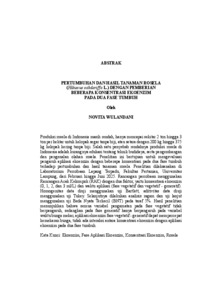 Produksi rosela di Indonesia masih rendah, hanya mencapai sekitar 2 ton hingga 3 ton per hektar untuk kelopak segar tanpa biji, atau setara dengan 200 kg hingga 375 kg kelopak kering tanpa biji. Salah satu penyebab rendahnya produksi rosela di Indonesia adalah kurangnya edukasi tentang teknik budidaya, serta pengembangan dan pengenalan olahan rosela. Penelitian ini bertujuan untuk mengevaluasi pengaruh aplikasi ekoenzim dengan beberapa konsentrasi pada dua fase tumbuh terhadap pertumbuhan dan hasil tanaman rosela. Penelitian dilaksanakan di Laboratorium Percobaan Lapang Terpadu, Fakultas Pertanian, Universitas Lampung, dari Februari hingga Juni 2025. Rancangan percobaan menggunakan Rancangan Acak Kelompok (RAK) dengan dua faktor, yaitu konsentrasi ekoenzim (0, 1, 2, dan 3 ml/L) dan waktu aplikasi (fase vegetatif dan vegetatif - generatif). Homogenitas data diuji menggunakan uji Bartlett, aditivitas data diuji menggunakan uji Tukey. Selanjutnya dilakukan analisis ragam dan uji lanjut menggunakan uji Beda Nyata Terkecil (BNT) pada taraf 5%. Hasil penelitian menunjukkan bahwa semua variabel pengamatan pada fase vegetatif tidak berpengaruh, sedangkan pada fase generatif hanya berpengaruh pada variabel waktu bunga mekar, aplikasi ekoenzim fase vegetatif - generatif dapat mempercepat kemekaran bunga, tidak ada interaksi antara konsentrasi ekoenzim dengan aplikasi ekoenzim pada dua fase tumbuh. Roselle production in Indonesia is still low, reaching only around 2 to 3 tons per hectare for fresh seedless calyx, or equivalent to 200 to 375 kg of dried seedless calyx. One of the causes of low roselle production in Indonesia is the lack of education on cultivation techniques, as well as the development and introduction of roselle processing. This study aims to evaluate the effect of ecoenzyme application with several concentrations at two growth phases on the growth and yield of roselle plants. The study was conducted at the Integrated Field Experiment Laboratory, Faculty of Agriculture, University of Lampung, from February to June 2025. The experimental design used a Randomized Block Design (RBD) with two factors, namely ecoenzyme concentration (0, 1, 2, and 3 ml/L) and application time (vegetative and vegetative - generative phases). Data homogeneity was tested using the Bartlett test, data additivity was tested using the Tukey test. Furthermore, analysis of variance and further tests were carried out using the Least Significant Difference (LSD) test at the 5% level. The results of the study showed that all observation variables in the vegetative phase had no effect, while in the generative phase it only had an effect on the variable of flower blooming time, the application of ecoenzyme in the vegetative - generative phase could accelerate flower blooming, there was no interaction between ecoenzyme concentration and ecoenzyme application in the two growth phases.