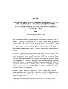 Karya ilmiah ini mengkaji perilaku pemilih salah satu generasi muda saat ini, generasi Z masyarakat transmigran Jawa di Desa Bagelen dalam menentukan prefrensi politik pada pemilihan kepala daerah Kabupaten Pesawaran 2024. Tujuan penelitian ini untuk mengetahui perilaku pemilih generasi Z transmigran Jawa di Desa Bagelen pada pemilihan kepala daerah Kabupaten Pesawaran 2024 dan mengkaji pengaruh karateristik generasi Z sebagai generasi muda terhadap perilaku pemilih. Teori karateristik generasi Z menjadi variabel tidak terikat dan teori perilaku pemilih menjadi variabel terikat. Metode penelitian ini menggunakan metode campuran dengan menggunakan model squential explanatory, model yang menjadikan metode kuantitatif dengan instrumen kuisioner sebagai data utama dan kualitatif dengan instrumen wawancara sebagai data pendukung. Hasil penelitian menunjukkan bahwa karakteristik Generasi Z berpengaruh signifikan terhadap perilaku pemilih. Selain itu, mayoritas responden memilih berdasarkan pendekatan rasional dan psikologis seperti visi-misi, program, dan track record kandidat, bukan kesamaan karakter sosiologis (kesamaan etnis/status transmigran). Simpulan dalam penelitian menyatakan bahwa karasteristik Generasi Z mempengaruhi generasi z masyarakat transmigran Jawa di Desa Bagelen untuk menentukan prefrensi politik yang mengutamakan substansi politik dari para kontestan yang berkontestasi. Kata Kunci: Generasi Z, perilaku pemilih, transmigran Jawa, preferensi politik. This scholarly work examines the voting behavior of one of the current young generations, namely Generation Z from the Javanese transmigrant community in Bagelen Village in determining political preferences in the 2024 Pesawaran Regency head election. The research objectives are to understand the voting behavior of young Javanese transmigrant Generation Z in Bagelen Village during the 2024 Pesawaran Regency head election and to examine the influence of Generation Z characteristics as the young generation on voting behavior. The theory of Generation Z characteristics serves as the independent variable and voting behavior theory serves as the dependent variable. This research employs a mixed-method approach using a sequential explanatory model, which makes quantitative methods with questionnaire instruments as primary data and qualitative methods with interview instruments as supporting data. The research results show that Generation Z characteristics have a significant influence on voting behavior. Furthermore, the majority of respondents voted based on rational and psychological approaches, such as candidates vision-mission, programs, and track record—rather than sociological character similarities (ethnic similarity/transmigrant status). The conclusion of the research states that Generation Z characteristics influence Generation Z of the Javanese transmigrant community in Bagelen Village to become young voters who prioritize the political substance of the competing contestants. Keywords: Generation Z, voting behavior, Javanese transmigrants, political preferences.