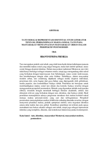 SHAN’IN EFRINA , FRESILIA (2025) TATO SEBAGAI REPRESENTASI IDENTITAS: STUDI LITERATUR TENTANG PERBANDINGAN MAKNA SOSIAL TATO PADA MASYARAKAT MENTAWAI DAN MASYARAKAT URBAN MODERN DALAM PERSPEKTIF POSTMODERN. FAKULTAS ILMU SOSIAL DAN ILMU POLITIK, UNIVERSITAS LAMPUNG.