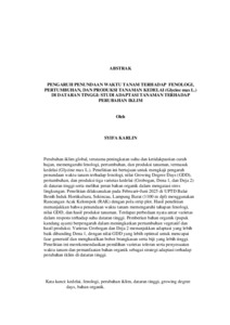 Perubahan iklim global, terutama peningkatan suhu dan ketidakpastian curah hujan, memengaruhi fenologi, pertumbuhan, dan produksi tanaman, termasuk kedelai (Glycine max L.). Penelitian ini bertujuan untuk mengkaji pengaruh penundaan waktu tanam terhadap fenologi, nilai Growing Degree Days (GDD), pertumbuhan, dan produksi tiga varietas kedelai (Grobogan, Dena 1, dan Deja 2) di dataran tinggi serta melihat peran bahan organik dalam mengatasi stres lingkungan. Penelitian dilaksanakan pada Februari–Juni 2025 di UPTD Balai Benih Induk Hortikultura, Sekincau, Lampung Barat (1100 m dpl) menggunakan Rancangan Acak Kelompok (RAK) dengan pola strip plot. Hasil penelitian menunjukkan bahwa penundaan waktu tanam memengaruhi tahapan fenologi, nilai GDD, dan hasil produksi tanaman. Terdapat perbedaan nyata antar varietas dalam respons terhadap suhu dataran tinggi. Pemberian bahan organik (pupuk kandang ayam) berpengaruh dalam meningkatkan pertumbuhan vegetatif dan hasil produksi. Varietas Grobogan dan Deja 2 menunjukkan adaptasi yang lebih baik dibanding Dena 1, dengan nilai GDD yang lebih optimal untuk mencapai fase generatif dan menghasilkan bobot brangkasan serta biji yang lebih tinggi. Penelitian ini merekomendasikan pemilihan varietas toleran serta penyesuaian waktu tanam dan pemanfaatan bahan organik sebagai strategi adaptasi terhadap perubahan iklim di dataran tinggi. Kata kunci: kedelai, fenologi, perubahan iklim, dataran tinggi, growing degree days, bahan organik.