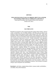 Penelitian ini bertujuan untuk menguji pengaruh rangkap jabatan direksi, reputasi auditor, profitabilitas, dan solvabilitas terhadap audit delay pada perusahaan yang terdaftar di Bursa Efek Indonesia (BEI) selama periode 2021–2023. Audit delay merupakan salah satu indikator penting ketepatan waktu pelaporan keuangan yang telah diaudit, di mana keterlambatan dapat menimbulkan ketidakpastian informasi serta menurunkan kepercayaan investor. Variabel independen yang digunakan dalam penelitian ini terdiri atas rangkap jabatan direksi yang mencerminkan beban tanggung jawab ganda dalam manajemen, reputasi auditor yang diproksikan melalui afiliasi Kantor Akuntan Publik (KAP) Big Four, serta indikator kinerja keuangan perusahaan yaitu profitabilitas (ROE) dan solvabilitas (DER). Penelitian ini menggunakan pendekatan kuantitatif dengan data panel dan metode analisis regresi data panel melalui perangkat lunak EViews 13. Sampel ditentukan dengan teknik purposive sampling terhadap 722 perusahaan yang memenuhi kriteria penelitian selama periode observasi, sehingga diperoleh 2.166 observasi. Pengujian dilakukan melalui uji asumsi klasik, uji Chow, uji Hausman, serta regresi panel. Hasil penelitian menunjukkan bahwa rangkap jabatan direksi berpengaruh negatif signifikan terhadap audit delay, yang mengindikasikan bahwa semakin tinggi intensitas rangkap jabatan, semakin rendah kemungkinan terjadinya keterlambatan penyampaian laporan audit. Sementara itu, reputasi auditor, profitabilitas, dan solvabilitas tidak berpengaruh signifikan terhadap audit delay. Temuan ini berkontribusi pada literatur akuntansi dan tata kelola perusahaan di Indonesia dengan memperkuat pemahaman mengenai determinan audit delay. Secara praktis, hasil penelitian ini diharapkan dapat menjadi acuan bagi regulator, auditor, dan manajemen perusahaan dalam meningkatkan ketepatan waktu pelaporan keuangan sebagai wujud transparansi dan akuntabilitas. Kata kunci: audit delay, rangkap jabatan direksi, reputasi auditor, profitabilitas, solvabilitas, Bursa Efek Indonesia. ABSTRACT THE INFLUENCE OF MULTIPLE DIRECTORSHIP, AUDITOR REPUTATION, AND COMPANY PERFORMANCE ON AUDIT DELAY (A Study on Companies Listed on the Indonesia Stock Exchange for the 2021– 2023 Period) This study aims to examine the effect of board interlocking, auditor reputation, profitability, and solvency on audit delay in companies listed on the Indonesia Stock Exchange (IDX) during the period 2021–2023. Audit delay is an important indicator of the timeliness of audited financial reporting, where delays may create information uncertainty and reduce investor confidence. The independent variables employed in this study consist of board interlocking, which reflects multiple managerial responsibilities; auditor reputation, proxied by affiliation with Big Four Public Accounting Firms (KAP); as well as financial performance indicators, namely profitability (ROE) and solvency (DER). The research applies a quantitative approach with panel data analysis using regression techniques through EViews 13. The sample was determined using purposive sampling on 722 firms that met the research criteria over the observation period, resulting in 2,166 firm-year observations. The statistical tests conducted include classical assumption testing, Chow test, Hausman test, and panel regression analysis. The findings reveal that board interlocking has a significant negative effect on audit delay, indicating that higher levels of multiple directorships reduce the likelihood of reporting delays. In contrast, auditor reputation, profitability, and solvency do not significantly affect audit delay. These results contribute to the literature on auditing and corporate governance in Indonesia by strengthening the understanding of factors influencing audit delay. Practically, the study provides insights for regulators, auditors, and corporate management in enhancing the timeliness of financial reporting as a form of transparency and accountability. Keywords: audit delay, board interlocking, auditor reputation, profitability, solvency, Indonesia Stock Exchange.