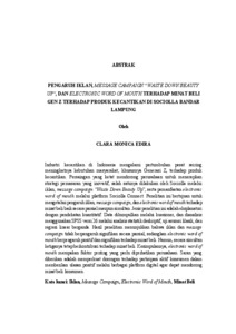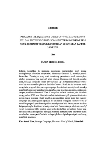 CLARA , MONICA EDIRA (2025) PENGARUH IKLAN, MESSAGE CAMPAIGN “WASTE DOWN BEAUTY UP”, DAN ELECTRONIC WORD OF MOUTH TERHADAP MINAT BELI GEN Z TERHADAP PRODUK KECANTIKAN DI SOCIOLLA BANDAR LAMPUNG. FAKULTAS ILMU SOSIAL DAN ILMU POLITIK , UNIVERSITAS LAMPUNG.