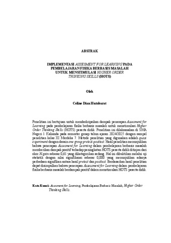 CELINE DIAN, HUTABARAT (2025) IMPLEMENTASI ASSESMENT FOR LEARNING PADA PEMBELAJARAN FISIKA BERBASIS MASALAH UNTUK MENSTIMULASI HIGHER ORDER THINKING SKILLS (HOTS). FAKULTAS KEGURUAN DAN ILMU PENDIDIKAN, UNIVERSITAS LAMPUNG.
