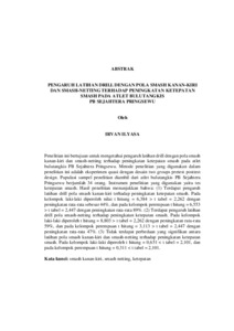 Penelitian ini bertujuan untuk mengetahui pengaruh latihan drill dengan pola smash kanan-kiri dan smash-netting terhadap peningkatan ketepatan smash pada atlet bulutangkis PB Sejahtera Pringsewu. Metode penelitian yang digunakan dalam penelitian ini adalah eksperimen quasi dengan desain two groups pretest posttest design. Pupulasi sampel penelitian diambil dari atlet bulutangkis PB Sejahtera Pringsewu berjumlah 34 orang. Instrumen penelitian yang digunakan yaitu tes ketepatan smash. Hasil penelitian menunjukkan bahwa: (1) Terdapat pengaruh latihan drill pola smash kanan-kiri terhadap peningkatan ketepatan smash. Pada kelompok laki-laki diperoleh nilai t hitung = 6,384 > t tabel = 2,262 dengan peningkatan rata-rata sebesar 44%, dan pada kelompok perempuan t hitung = 6,553 > t tabel = 2,447 dengan peningkatan rata-rata 89%. (2) Terdapat pengaruh latihan drill pola smash-netting terhadap peningkatan ketepatan smash. Pada kelompok laki-laki diperoleh t hitung = 8,803 > t tabel = 2,262 dengan peningkatan rata-rata 59%, dan pada kelompok perempuan t hitung = 3,113 > t tabel = 2,447 dengan peningkatan rata-rata 47%. (3) Tidak terdapat perbedaan yang signifikan antara latihan pola smash kanan-kiri dan smash-netting terhadap peningkatan ketepatan smash. Pada kelompok laki-laki diperoleh t hitung = 0,651 < t tabel = 2,101, dan pada kelompok perempuan t hitung = 0,311 < t tabel = 2,101. Kata kunci: smash kanan-kiri, smash netting, ketepatan